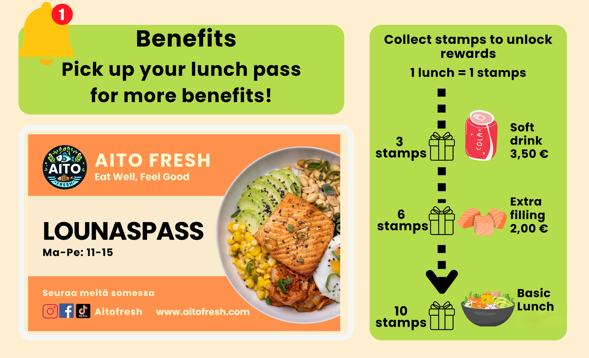 Hi, We're a team of passionate food lovers. We believe that the freshness of foods would make a difference. Fresh ingredients taste good. We cook them freshly with Asian flavor. We love Korean foods. We love Donburi and wok. We make brilliant fillet from salmon with hot pan grilling. We care. And we want our foods and service can make you happy. Looking forward to hearing and seeing you! BR. yours, Aito Fresh.